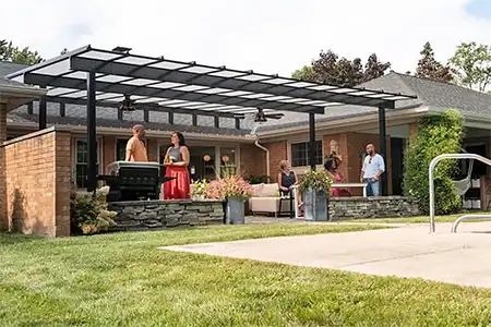The structural aluminum frame not only keeps you safe from the elements, but is engineered to withstand wind, rain, hail and snow. The Lexan® roof panels have a UV protective coating and cooling properties, and combined with the powder-coated aluminum frame create a maintenance-free, translucent outdoor structure.
